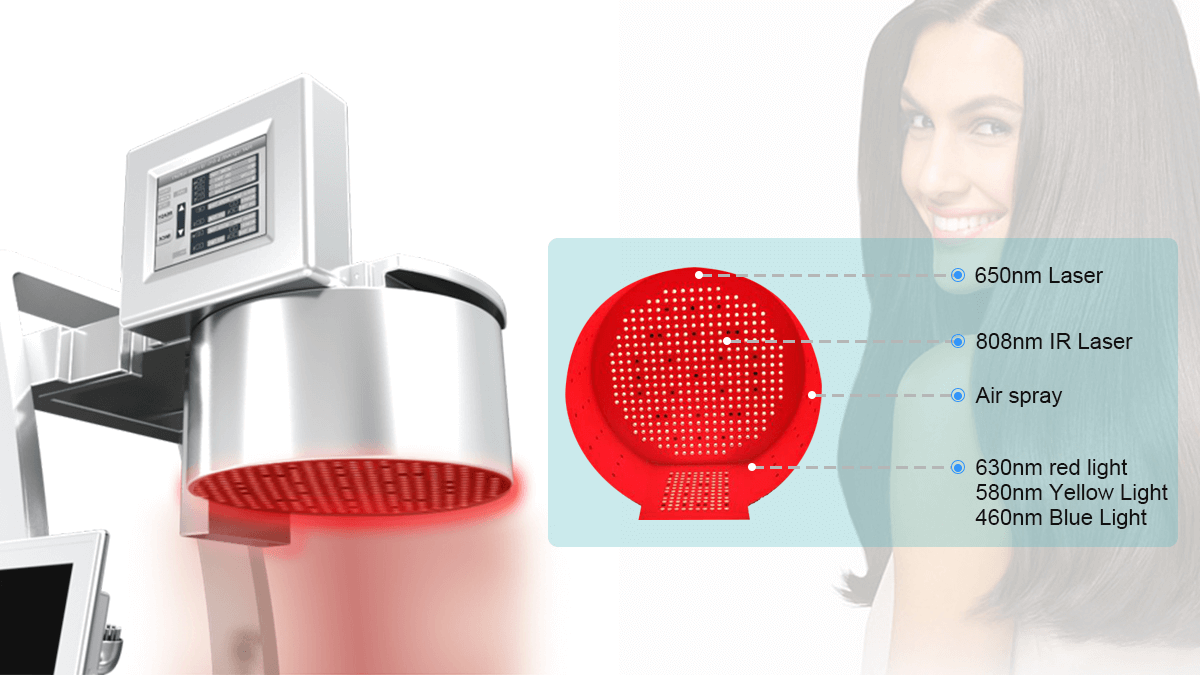 Esta máquina está diseñada para promover el crecimiento del cabello y mejorar la salud capilar, usando tecnología láser de baja potencia combinada con diferentes longitudes de onda de luz fría para proporcionar un tratamiento efectivo y seguro.